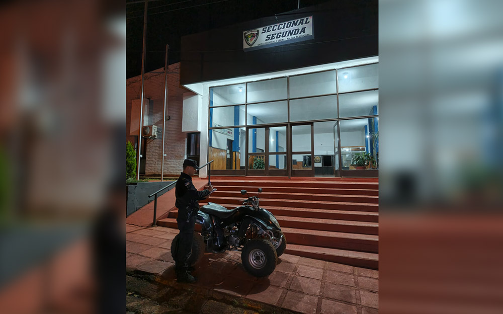 La Policía de Misiones intervino esta madrugada en el barrio Ecológico de Oberá, donde secuestró un cuatriciclo que se desplazaba a gran velocidad y realizaba maniobras temerarias, generando preocupación entre los vecinos.