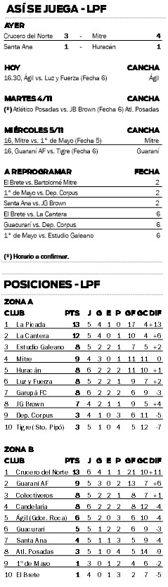 Más allá de la intensa lluvia que afectó a gran parte de la región y que derivó en la suspensión de tres encuentros, en Santa Inés y Santa Ana hubo actividad de la sexta fecha del Torneo Clausura de la Liga Posadeña de Fútbol.