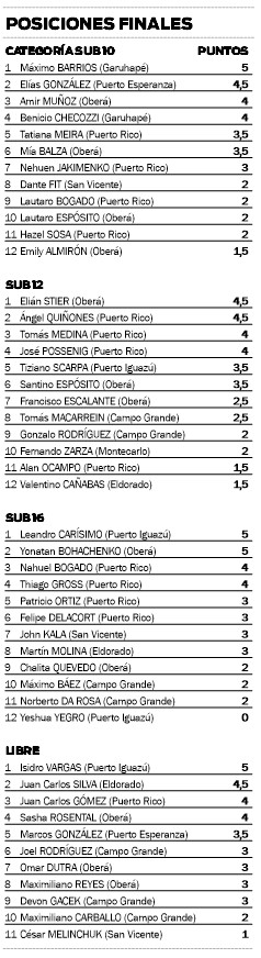 Tras una ardua competencia, Máximo Barrios de Garuhapé se consagró como el campeón provincial en la categoría Sub 10; Elián Stier de Oberá fue el ganador en Sub 12, mientras que Leandro Carísimo de Puerto Iguazú festejó en Sub 16. En Libre, Isidro Vargas, también de Iguazú, se subió a lo más alto del podio.