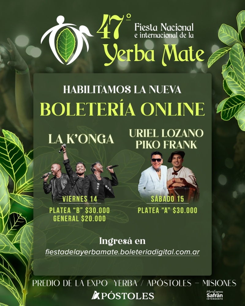 La organización de la 47ª Fiesta Nacional e Internacional de la Yerba Mate anunció que ya se encuentra disponible la venta de entradas a través de una nueva boletería virtual. De esta manera, el público podrá adquirir sus tickets de forma rápida, sencilla y segura desde cualquier dispositivo con acceso a internet.