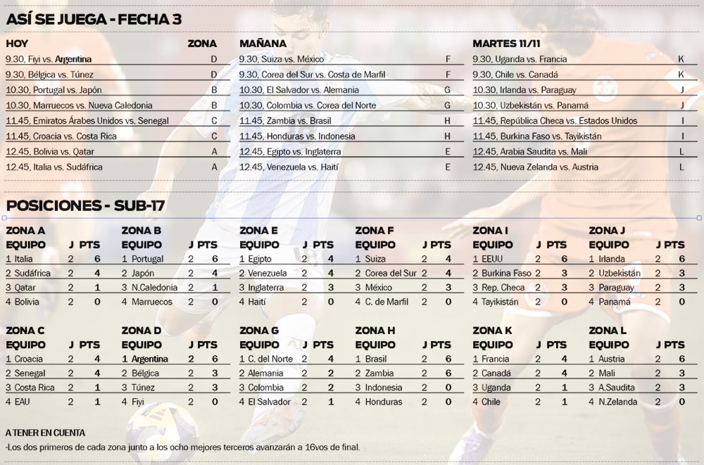 El equipo dirigido por Diego Placente ya está clasificado a la próxima fase, los 16vos de final, por lo que buscará hoy cerrar la etapa inicial con una victoria que le permita asegurarse el primer puesto del grupo. En el mismo horario, Bélgica y Túnez chocarán en busca del boleto a la fase final, a sabiendas de que clasifican no solo los dos mejores de cada zona, sino también los ocho mejores terceros.
