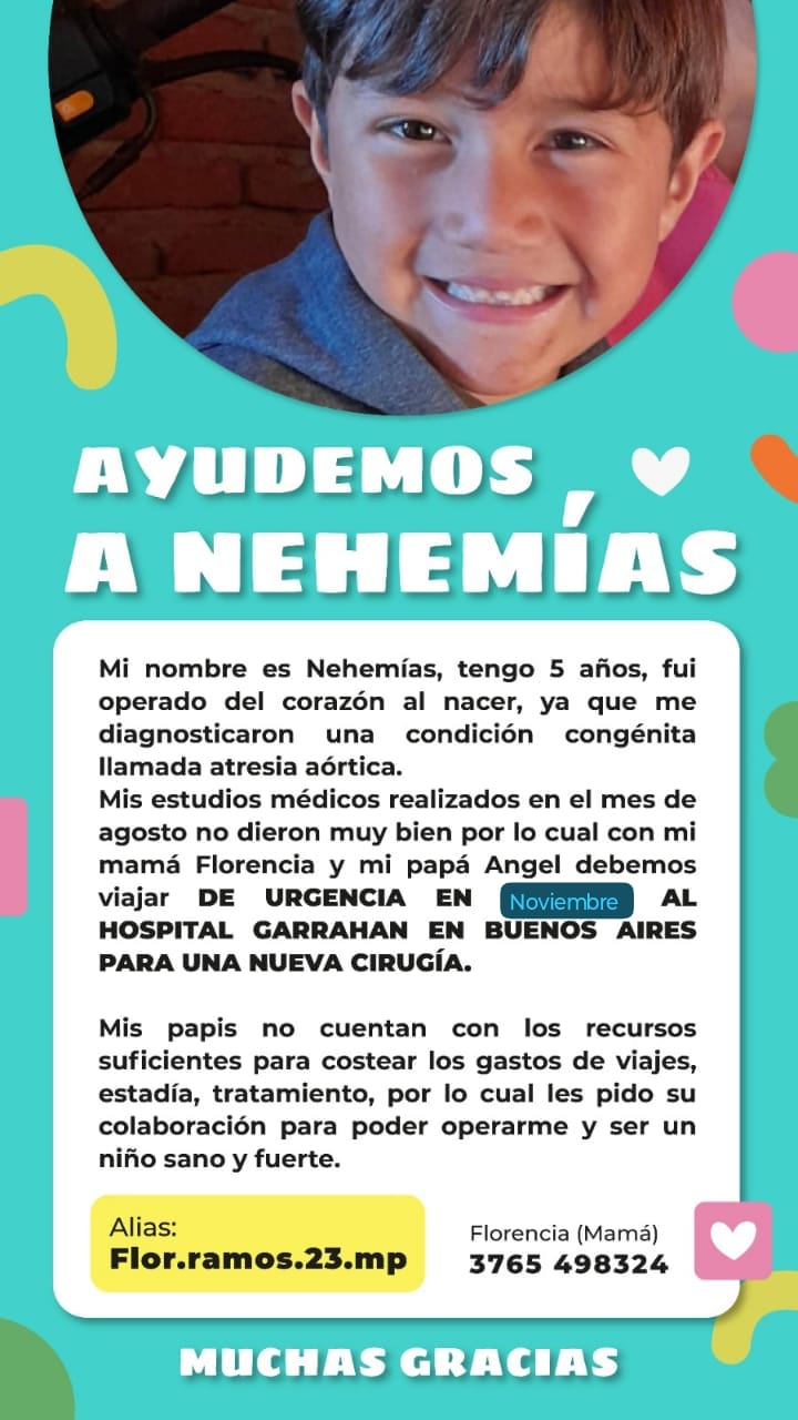 Con apenas cinco años, Nehemías Rojas enfrenta una nueva batalla por su vida. El pequeño padece atresia aórtica, una compleja afección congénita del corazón por la que fue operado a los diez días de nacer. Ahora, junto a su familia, viajó nuevamente desde Posadas a Buenos Aires para una cirugía correctiva en el Hospital Garrahan y necesita la colaboración solidaria de los misioneros para poder afrontar los gastos de estadía y alimentación durante el tratamiento.