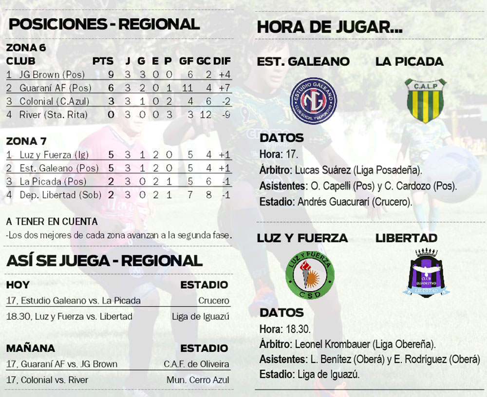 El otro duelo de la jornada tendrá como animadores a Luz y Fuerza y Libertad de El Soberbio. En esta ocasión, el Eléctrico volverá a hacer de local en el estadio de la Liga de Iguazú, a partir de las 18.30, con el arbitraje de Leonel Krombauer, de la Liga Obereña.