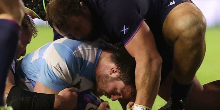 El inicio del partido fue un “olvido” para el seleccionado argentino. Escocia, con un juego sólido y aprovechando una tarjeta amarilla al cordobés Juan Cruz Mallía, llegó a sacar una ventaja demoledora de 21-0 antes de la mitad del segundo tiempo, con una actuación estelar del fly half Finn Russell.