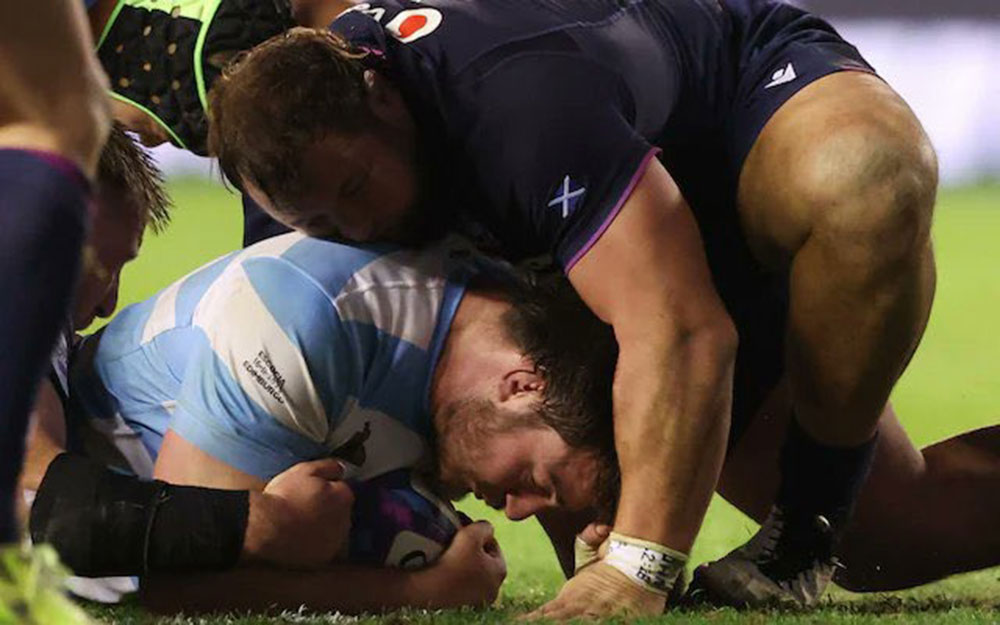 El inicio del partido fue un “olvido” para el seleccionado argentino. Escocia, con un juego sólido y aprovechando una tarjeta amarilla al cordobés Juan Cruz Mallía, llegó a sacar una ventaja demoledora de 21-0 antes de la mitad del segundo tiempo, con una actuación estelar del fly half Finn Russell.
