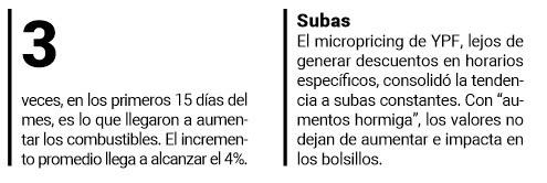 En la estación YPF ubicada en el centro de la capital, la nafta súper se ubicó en $ 1.639, desde $ 1.603 la semana pasada, lo que implica $ 36 de alza y 2,25%; 50 litros cuestan $ 81.950. La Infinia subió de $ 1.822 a $ 1.864, $ 42 adicionales y 2,31%, con un tanque de 50 litros valuado en $ 93.200. El Infinia diésel escaló de $ 1.855 a $ 1.903, $ 48 y 2,59%, de modo que 80 litros alcanzan $ 152.240.
