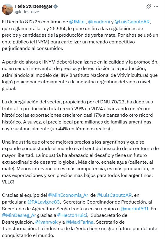El ministro de Desregulación y Transformación del Estado, Federico Sturzenegger, salió a respaldar con fuerza la decisión del Gobierno nacional de vaciar por completo de poder regulatorio al Instituto Nacional de la Yerba Mate (INYM), luego de la publicación del Decreto 812/2025 que elimina las principales facultades históricas del organismo. Lo hizo a través de un extenso mensaje difundido en su cuenta de X, en el que presentó la medida como un “fin a las regulaciones de precios y cantidades” en el sector.