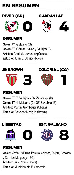 Por su lado, Estudio Galeano se floreó en El Soberbio. Si bien estaba clasificado de antemano, no dejó dudas ante Libertad y se impuso por un aplastante 8-0 para quedar como solitario líder de la Zona 7. Fernando Verón (2), Lisandro Dutra, Rodrigo Bareiro, Milton Colman, José Dujaut, Tomás Castaño y Damián Melgarejo marcaron el equipo de Claudio Fileppi.
