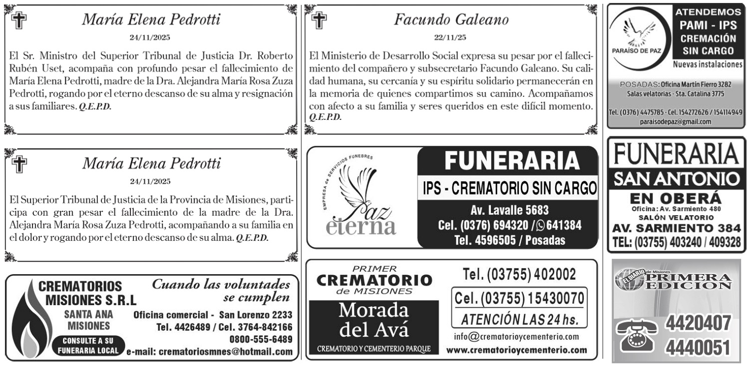 • Fúnebres del Sábado 22 de Noviembre de 2025