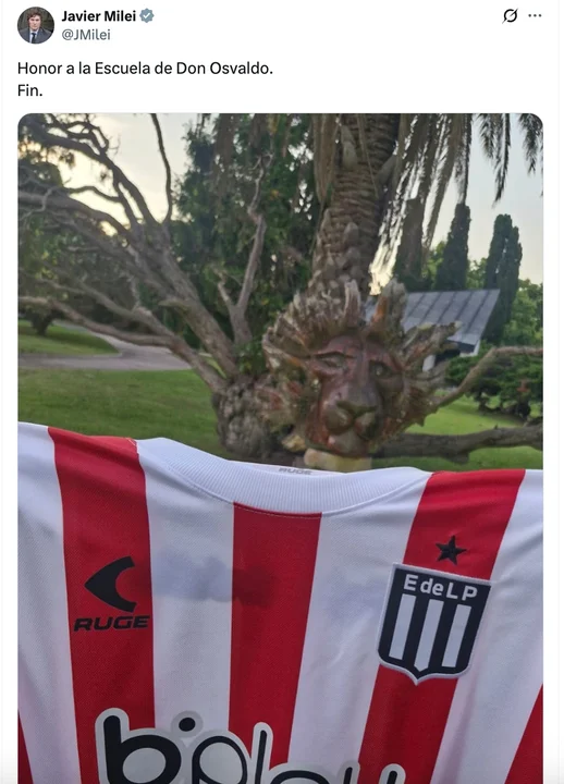 Desde la Quinta de Olivos, Milei tuiteó una foto de la camiseta de Estudiantes, acompañada de un mensaje conciso que hace referencia a una de las figuras más importantes de la historia del club. “Honor a la Escuela de Don Osvaldo. Fin”, escribió.