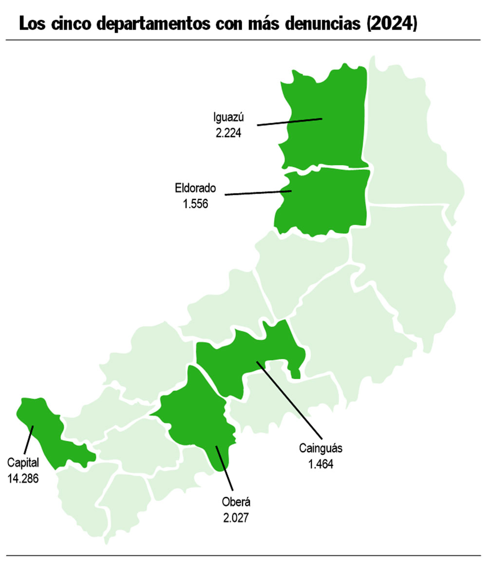 El informe del IPEC revela que la mayor cantidad de denuncias se concentra en los departamentos más poblados. Capital encabeza el ranking provincial, con 14.286 denuncias, seguido por Iguazú (2.224) y Oberá (2.027).