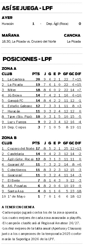 La actividad continuará mañana, con un imperdible encuentro: se cruzarán La Picada y Crucero del Norte, dos de los grandes protagonistas del certamen. El duelo será en Villa Cabello, a las 16.30. El Tren es escolta de la Zona A y el Colectivero el puntero de la Zona B.