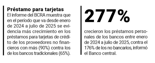 El informe del BCRA muestra que en el período que va desde enero de 2024 a julio de 2025 se evidencia más crecimiento en los préstamos personales de los bancos (277%) respecto de los no bancarios (176%), mientras que la relación se invierte para tarjetas de crédito, dado que los proveedores no financieros crecieron más (90%) que las del bancos tradicionales (65%).