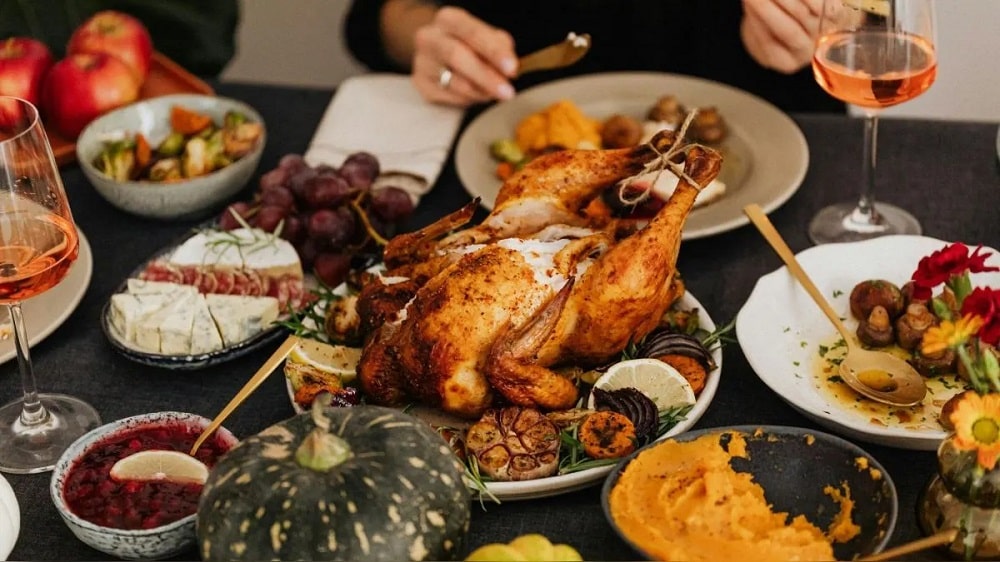 El plato tradicional para la cena consiste en un pavo asado y horneado, acompañado con maíz, puré de patatas o batatas, salsa de arándanos rojos y gravy (salsa hecha con el jugo del pavo), acompañado de pastel de manzana o de calabazas.