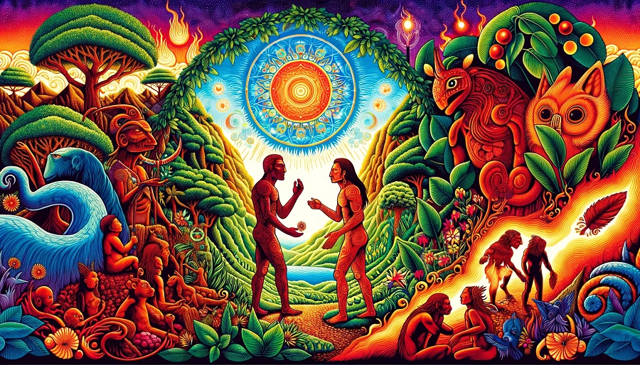 En la tradición guaraní, el color aparece como parte del tejido vivo: de los bosques, los ríos, los cultivos, los tejidos, los símbolos. Por ejemplo, en la lengua guaraní no existía originalmente una palabra específica que equivaliera exactamente a “color” en el sentido abstracto occidental. Se decía que un objeto tenía cierto “aspecto” (mboje’o) antes de cambiarlo.