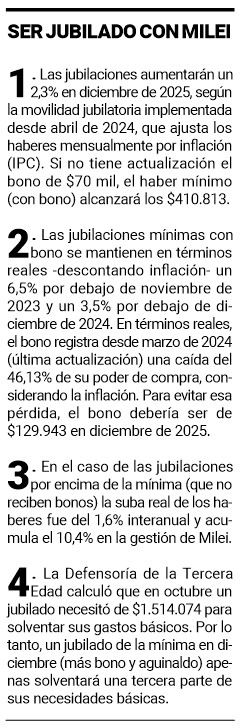 La última estimación de la Defensoría fue de $1.514.074 para octubre. Por lo tanto, lo que cobrará un jubilado de la mínima en diciembre (con bono y aguinaldo incluidos) alcanzaría a solventar una tercera parte de sus necesidades básicas. De hecho, en el último año el ingreso más bajo de diciembre pasó de cubrir el 49,5% de una canasta al 38,3% en 2025.
