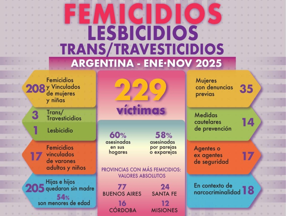 La Casa del Encuentro difundió un nuevo informe del Observatorio de Femicidios en Argentina “Adriana Marisel Zambrano”, que registró 229 víctimas de violencia de género entre enero y noviembre de 2025. El reporte contabilizó 208 femicidios, un lesbicidio, tres transfemicidios y 17 femicidios vinculados de varones adultos y niños. La organización volvió a advertir que, pese a los años de mediciones, las cifras “se sostienen en el tiempo” y no muestran señales de descenso.