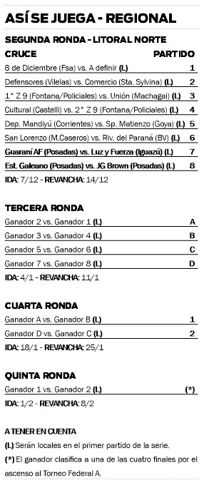 El Consejo Federal reveló como sigue el Torneo Regional Federal Amateur y habrá eliminación entre los representantes misioneros. Guaraní se medirá con Luz y Fuerza de Iguazú y Brown chocará con Estudio Galeano. Las series arrancarán este fin de semana.
