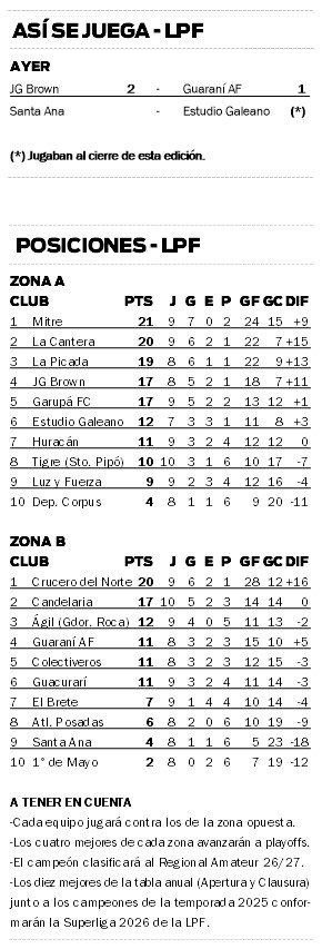 Jorge Gibson Brown se impuso por 2-1 ante Guaraní Antonio Franco (GAF) en un duelo correspondiente a la novena fecha del Torneo Clausura de la Liga Posadeña y se volvió a meter en puesto de clasificación.