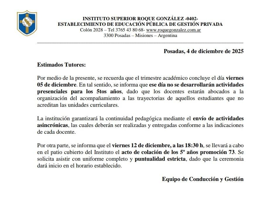 Desde el colegio remarcaron que la continuidad pedagógica se garantizaría mediante actividades asincrónicas, y recordaron que el acto de colación de los 5º años -Promoción 73- se realizará el próximo viernes 12 de diciembre, a las 18.30, en el patio cubierto del establecimiento, con pedido expreso de asistencia puntual.