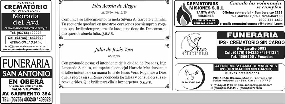 Fúnebres del Sábado 6 de Diciembre de 2025
