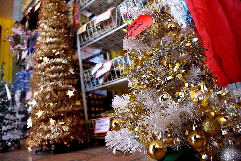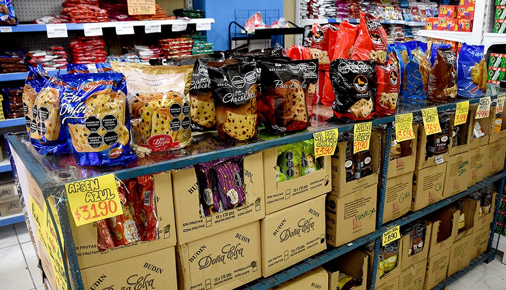 Guirnaldas nevadas a 700 pesos, cintas a 2.300 y mangueras de diez metros a 12 mil. Los panes dulces por unidad alcanzan los 1.690 pesos o la caja a 10.800; budines a 10.800 pesos la caja y turrones navideños a 400 pesos.