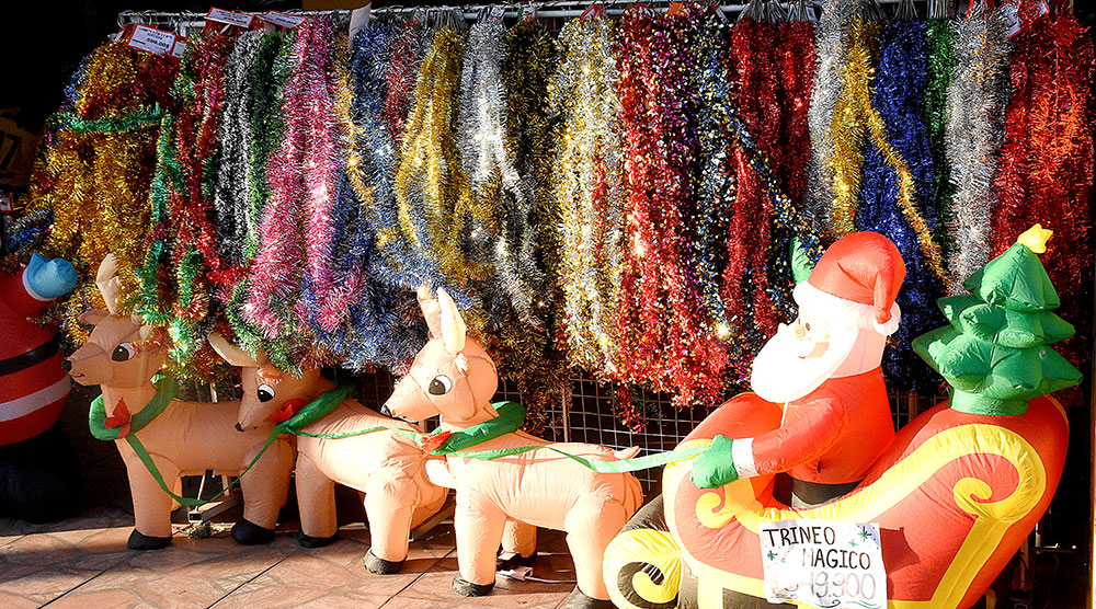 El traje de Papá Noel cuesta 38 mil y globos alusivos a la Navidad se comercializan a partir de mil pesos. Hay campanitas, bochas de distintos tamaños, luces de bochas a 7.800, moños grandes a tres mil pesos y variedad de flores.