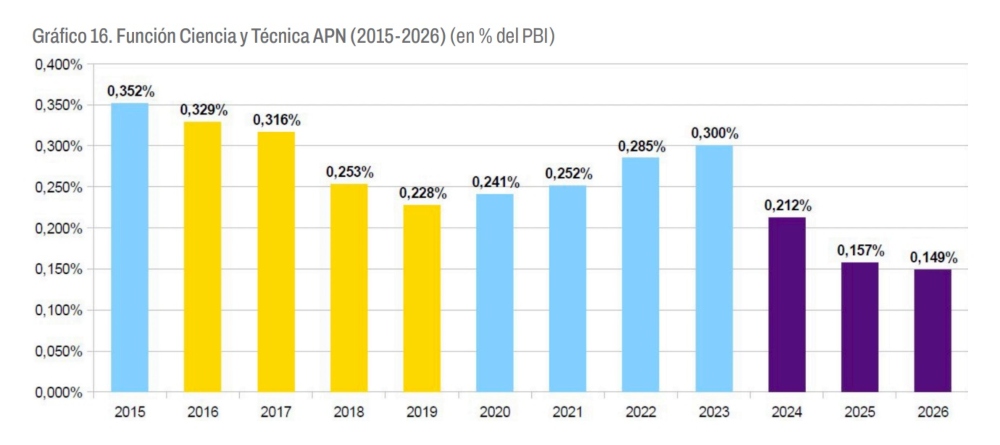 Y la situación se profundizará el año próximo: el proyecto del Presupuesto 2026 prevé que la inversión en ciencia represente apenas 0,149% del PBI, el valor más bajo desde 1972. La cifra se aleja además de la meta establecida por la Ley de Financiamiento de la Ciencia y la Tecnología: 0,52% del PBI.