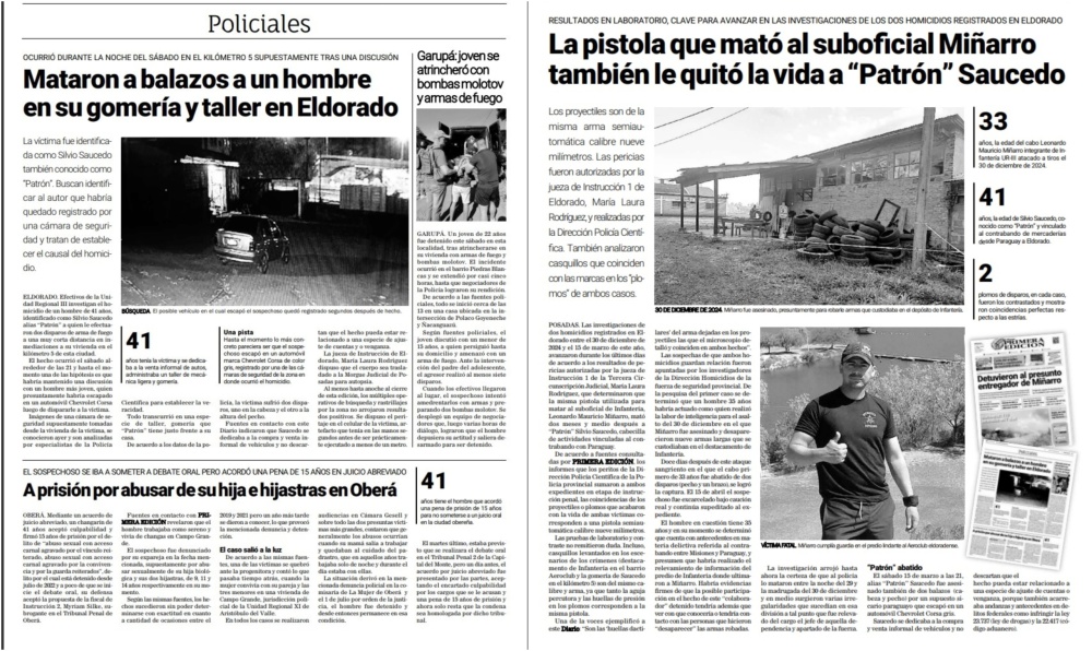 Vale recordar que, como también lo publicó de manera exclusiva PRIMERA EDICIÓN, las investigaciones de los dos homicidios determinaron en julio pasado que la misma pistola utilizada para matar al suboficial Miñarro mató “Patrón” Saucedo, presunto cabecilla de actividades vinculadas al contrabando con Paraguay.