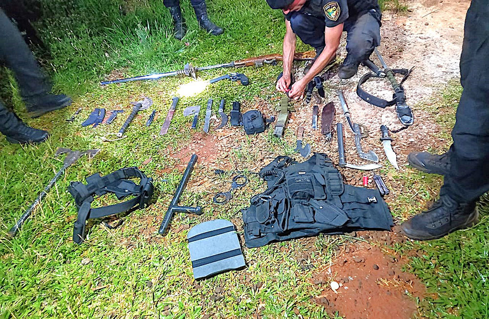 En la inspección hallaron seis hachas, dos foizas, una katana con vaina, once cuchillos de distintos tamaños, una manopla, un mazo metálico con puntas, dos armas de utilería, cartuchos calibres 36 y 28, chalecos y equipamiento táctico, una tonfa, documentación apócrifa y un porta credencial con escudo nacional.