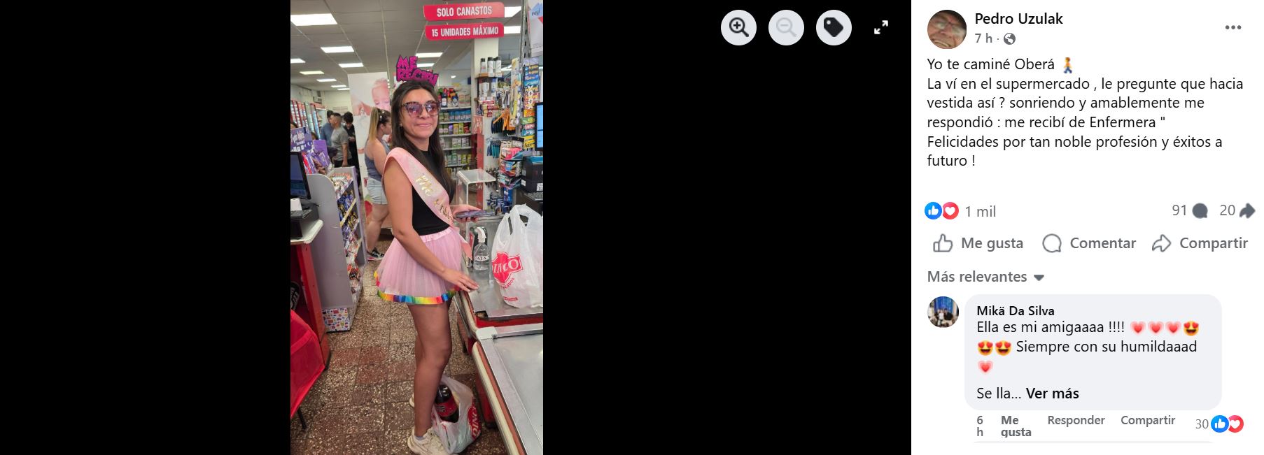 “Yo la vi en el supermercado, le pregunté por qué estaba vestida así y sonriendo me respondió que se había recibido de enfermera”, relató Pedro Uzulak, el usuario que difundió la foto y que destacó el gesto con un mensaje de felicitación por “tan noble profesión”. Esa breve anécdota fue suficiente para que la publicación comenzara a multiplicarse y generara una fuerte identificación colectiva.