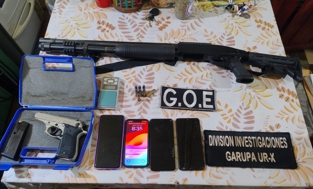 En el inmueble en tanto, se secuestró un arma de fuego de fabricación militar de Brasil ST-12 Tauro 12-70, un arma de fuego tipo Bersa 9 milímetros con cargador y 8 proyectiles de calibre 38, una balanza de precisión, como así también cinco teléfonos celulares de diferentes marcas, todos elementos enviados a pericias.