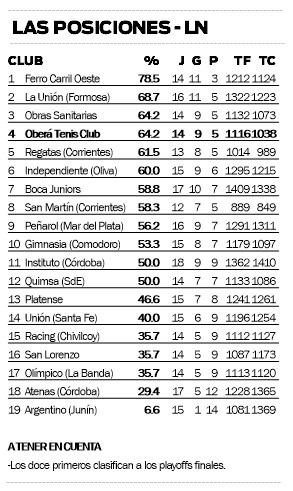 Si bien es cierto que el cierre de año no pudo ser con una sonrisa, el balance es positivo para el Oberá Tenis Club. Más allá de la derrota del último domingo por la noche en casa ante Obras Sanitarias, por 78-66, el Celeste se mantiene entre los cuatro primeros de la tabla de posiciones de la Liga Nacional de básquetbol.