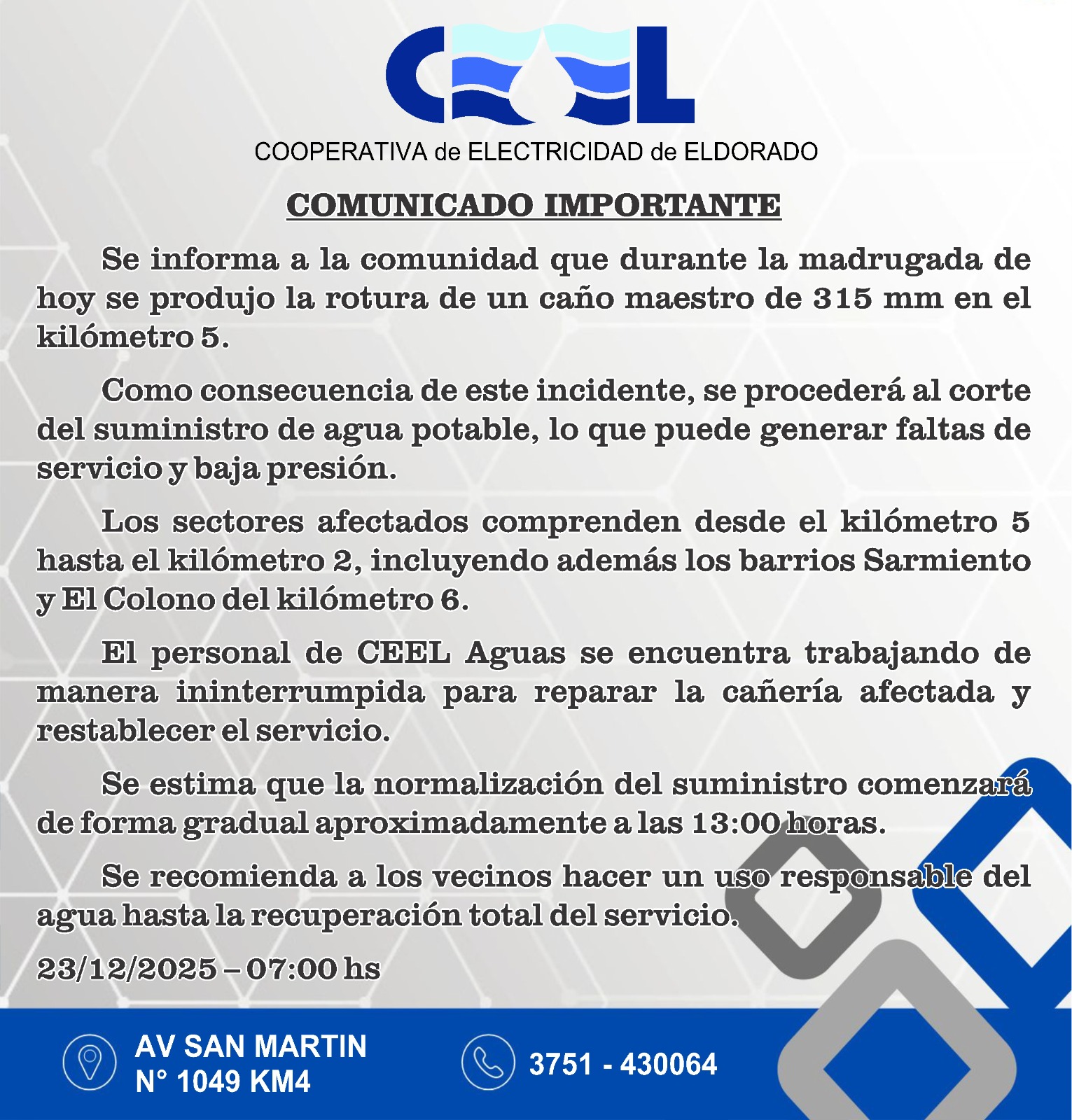 “El personal de CEEL Aguas se encuentra trabajando de manera ininterrumpida para reparar la cañería afectada y restablecer el servicio. Se estima que la normalización del suministro comenzará de forma gradual aproximadamente a las 13″, se comunicó. Asimismo, recomiendan a los vecinos hacer un uso responsable del agua hasta la recuperación total del servicio.