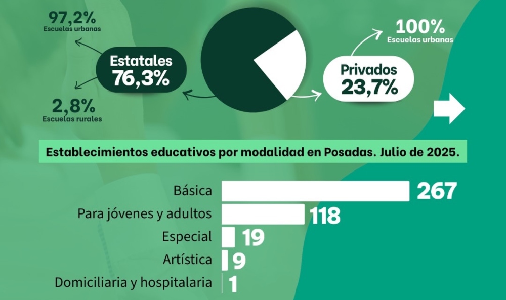 El informe también señala una fuerte presencia de la educación estatal en la ciudad. El 76,3% de los establecimientos educativos de Posadas son de gestión pública y el 23,7% privados. Esta distribución se replica en la matrícula, ya que el 62,7% de los niños, niñas y adolescentes de entre 4 a 17 años concurre a escuelas estatales.