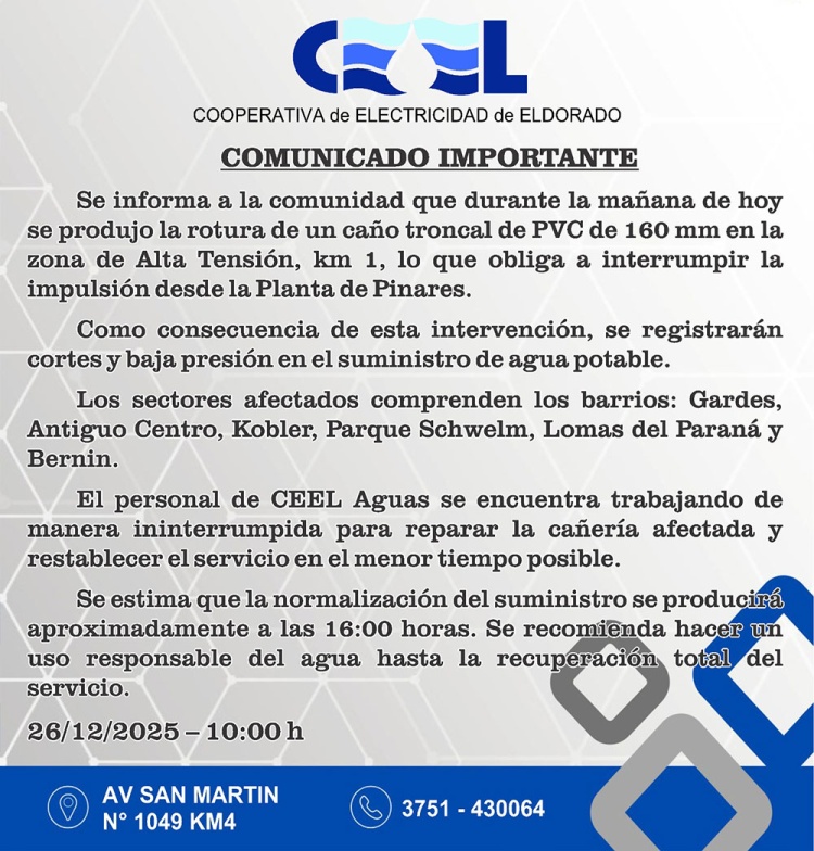 Desde la cooperativa indicaron que personal técnico de CEEL Aguas trabaja de manera ininterrumpida para reparar la cañería dañada y restablecer el servicio en el menor tiempo posible. Según las estimaciones oficiales, la normalización paulatina del suministro comenzaría alrededor de las 16 horas.