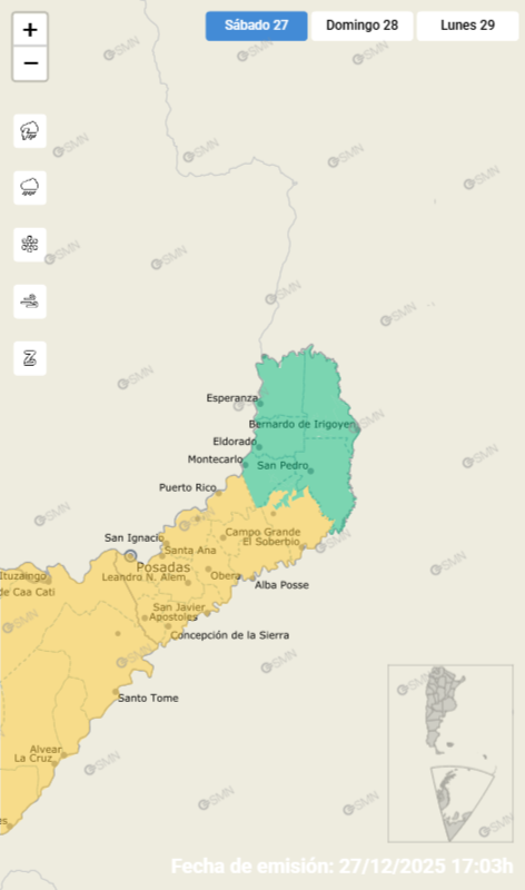 El Servicio Meteorológico Nacional emitió este domingo a las 17 una alerta amarilla por lluvias y tormentas para la zona sur y centro de Misiones, en una jornada marcada por el calor intenso y el aumento progresivo de la inestabilidad. El aviso alcanza a la tarde de hoy y se extiende al lunes, en un escenario donde ya se registran chaparrones aislados y elevadas sensaciones térmicas.