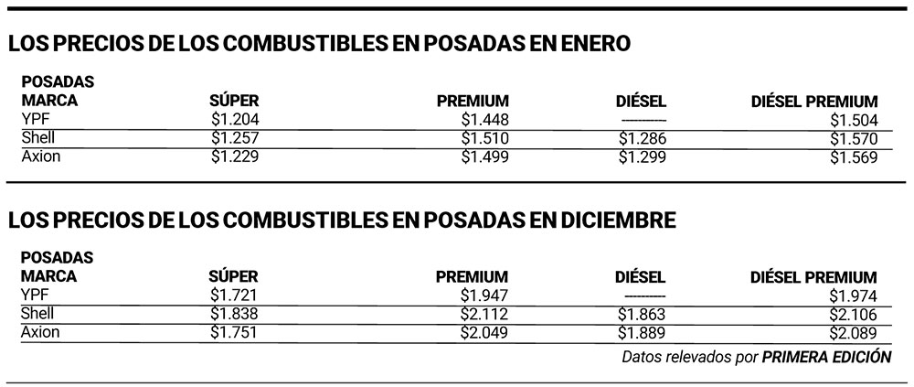 En Axion, los precios actuales en Posadas reflejan una evolución muy similar. La nafta súper pasó de $1.229 a $1.751, con un aumento nominal de $522 y una suba del 42,5%. La Quantium se incrementó de $1.499 a $2.049, lo que implica $550 más por litro y un ajuste del 36,7%.