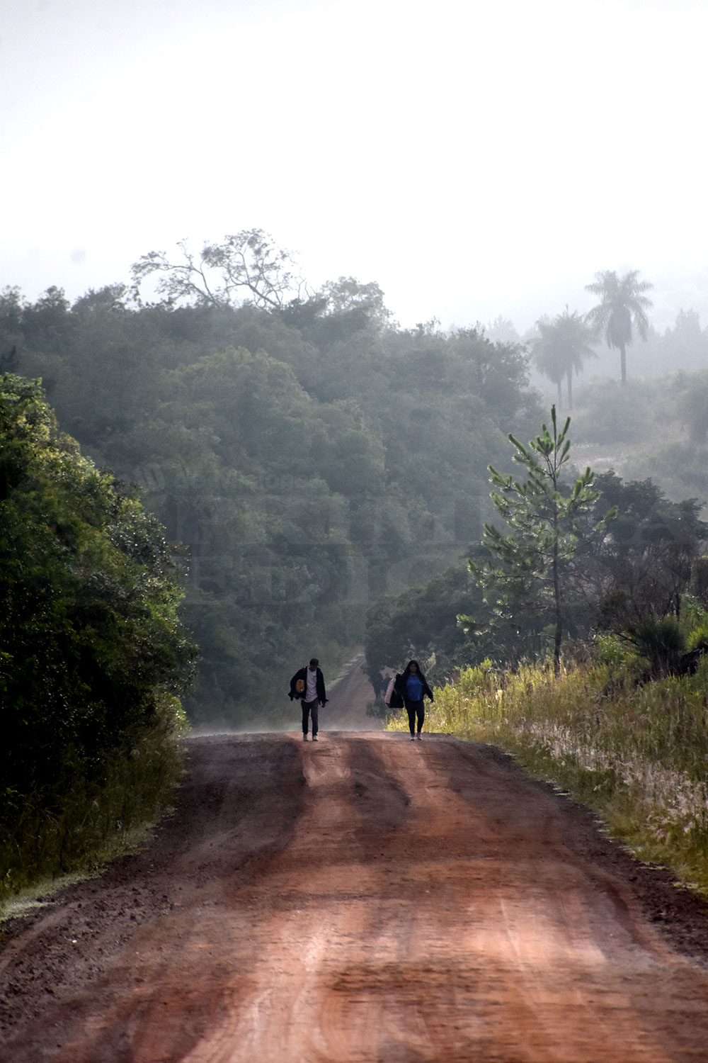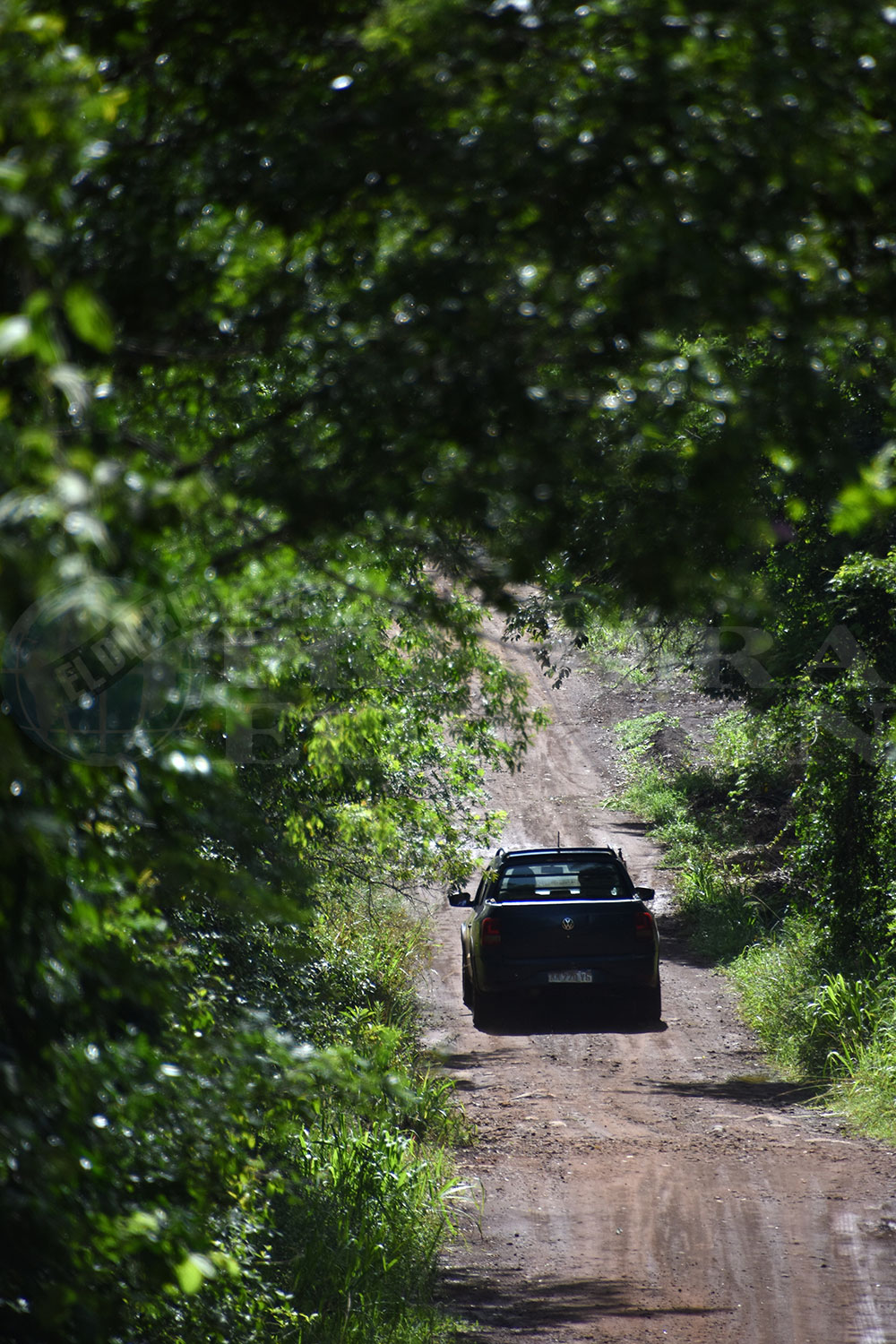 Después de la parada en el balneario, el grupo otra vez retoma la picada. El camino se angosta, el monte se cierra. Hay tramos de vegetación nativa densa y otros donde la forestación marcó cambios productivos, cada tanto aparece algunas chacra perdida que linda con el camino. El auto avanza a buen ritmo, porque el camino se encuentra muy bien, pese a la lluvia que días atrás dejó tramos de “pantanos rojos”, porque el monte es tan cerrado que la tierra todavía no se secó.