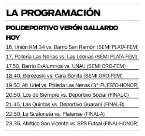 El plato fuerte estará en el cierre de la jornada, desde las 23.35, cuando Atlético San Vicente y SPS Futsal jueguen por el título de campeón en la final única de Honor. Anteriormente, La Scaloneta y Platense harán lo propio en busca del título de la A; mientras que en la previa, Las Quintas y Deportivo Guaraní jugarán por la corona de la B. Además, desde las 20.50, Los de Siempre y Deportivo Social se medirán por el título de la C.