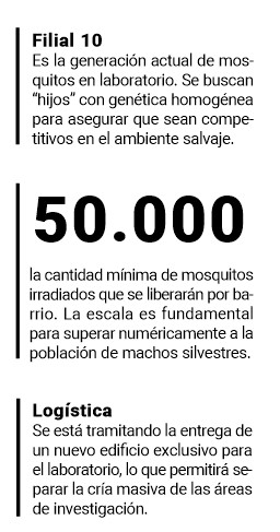 El equipo de investigación trabaja actualmente en la “filial 10”, una camada de mosquitos con homogeneización genética. Esto garantiza que el macho liberado sea estable, eficaz y capaz de competir con los silvestres para copular con las hembras, generando huevos no viables.