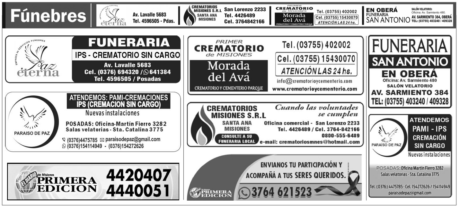 • Fúnebres del Sábado 27 de Diciembre de 2025