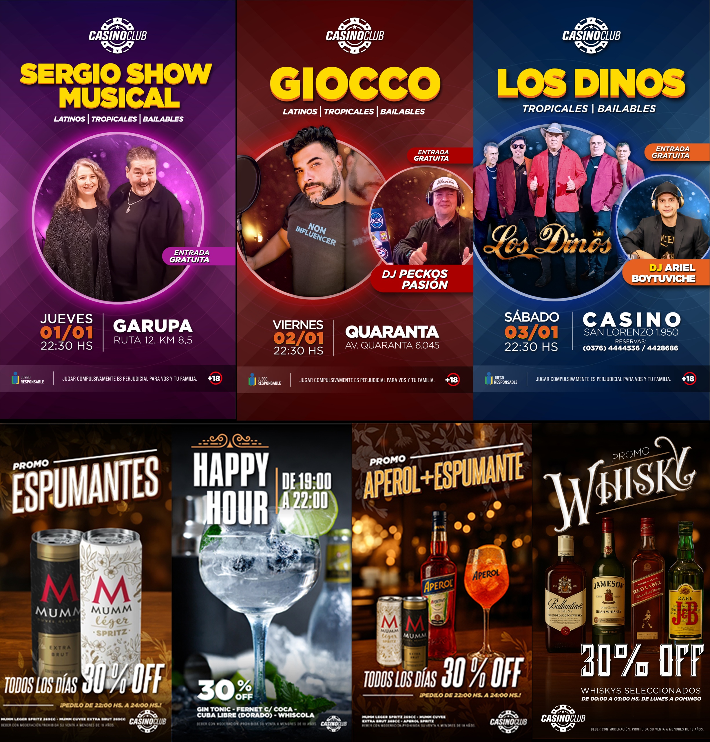 Casino Club prepara una intensa agenda de espectáculos para despedir 2025 y recibir el nuevo año en sus distintas salas de Misiones, con propuestas musicales, cenas, shows en vivo y pista bailable, todas con entrada libre y gratuita desde las 22.30.
