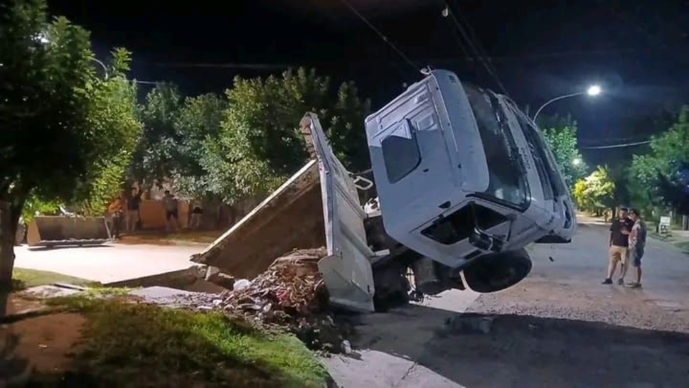 Según relataron testigos, el pavimento se hundió mientras el vehículo realizaba su recorrido habitual, provocando que una parte del camión quedara “tragada” por la calzada. Afortunadamente, no se registraron personas heridas, aunque el episodio encendió las alarmas por el estado de la infraestructura urbana.