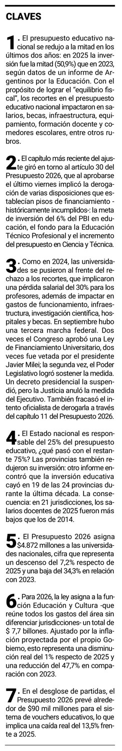 La Ley de Presupuesto para 2026 aprobada por el Congreso incorporó, finalmente, el discutido artículo 30: es el que, entre otras cosas, deroga el artículo 9 de la Ley 26.206, que establece que “el Estado garantiza el financiamiento del Sistema Educativo Nacional”. Ese financiamiento, aclara, no podrá ser inferior al 6% del PBI.