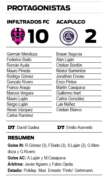 El experimentado base Rodrigo “Piru” Gómez (3), el goleador Federico Bado (3), los habilidosos Sergio Luján y Gonzalo Rivero, además del arquero Germán Mendoza, marcaron los tantos que le dieron la vuelta olímpica a Infiltrados. Por el lado de Acapulco, Alan Luján y Martín Casapava marcaron el descuento.