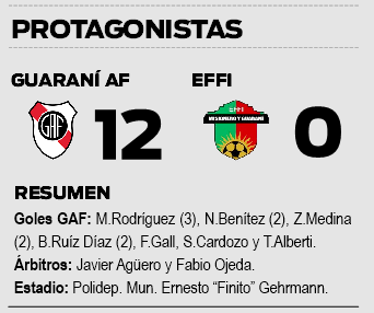 Las dirigidas por Martín Gallardo no tuvieron contemplaciones y golearon por 12-0 a la Escuela Formativa de Fútbol Infantil (EFFI) de San Ignacio. Los goles del triunfo fueron obra de la emblemática Macarena Rodríguez (3), Naeli Benítez (2), Zaira Medina (2), Belén Ruíz Díaz (2), la capitana Fabiana Gall, Sol Cardozo y Tania Alberti.
