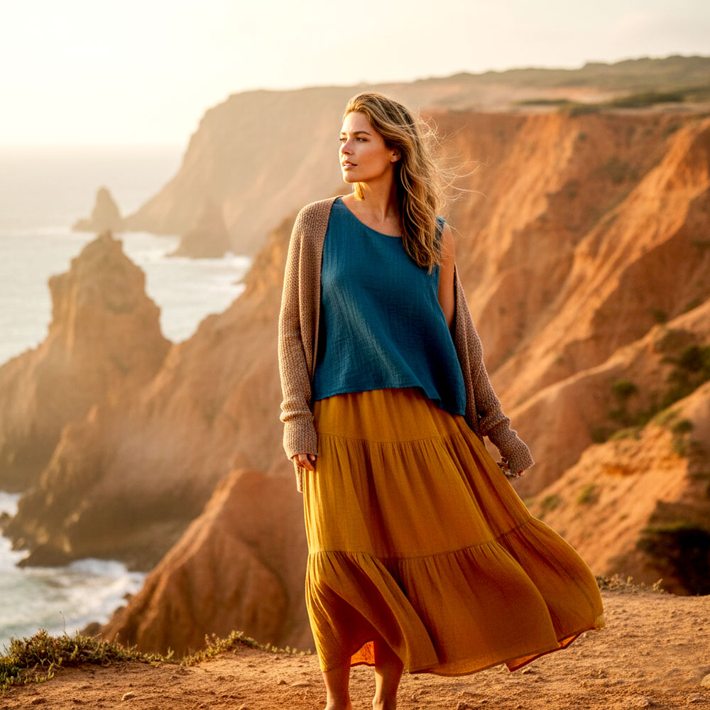 Imagina la brisa del atardecer en tu piel. Los tejidos naturales no solo son ideales para las altas temperaturas, sino que sus texturas irregulares y su caída orgánica nos invitan a un ritmo más lento, a la autenticidad. Piensa en lino arrugado con gracia, algodón suave que respira contigo, o la frescura del ramio.