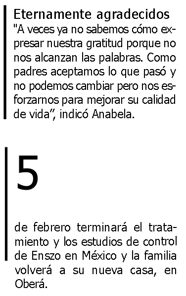 Los padres de Enszo contaron con el apoyo incondicional de los obereños y de los misioneros en general para poder juntar los 40.000 dólares necesarios para pagar el tratamiento y los gastos para viajar y permanecer poco más de un mes en México. “Estamos tan felices de haberlo logrado, la gente 100% pendiente… tenemos más de 60 mensajes para responder en las redes en este momento y estamos más que agradecidos con todos”, aseguró Anabela.