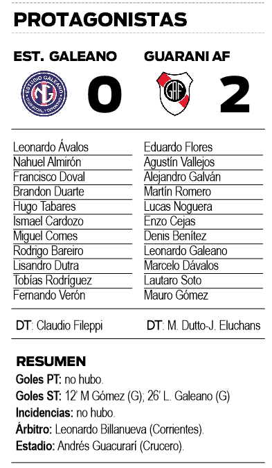 Después, Guaraní supo controlar y manejar el juego para quedarse con la victoria por 2-0. Un triunfo que le da tranquilidad para la vuelta en su casa. Estudio Galeano, por su parte, deberá remontar la serie como visitante.